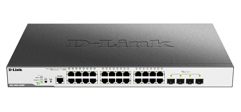 Коммутатор D-Link DGS-3000-28XMP/B1A, L2 Managed Switch 24 порта 10/100/1000Base-T ( 24 PoE порта 802.3af/802.3at (30 W), PoE Бюджет 370W) 4 порта 10GBase-X SFP+ 16K Mac address, 802.3x Flow Control