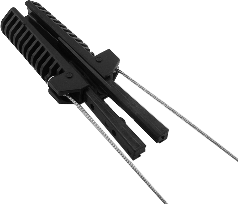 Используется для крепление оптического кабеля на опорах. Зажимы устанавливаются в начале и конце трассы, на ее поворотах. Кроме того, анкерные зажимы могут использоваться в нескольких точках посреди длинного прямолинейного участка, в местах значительной растягивающей нагрузки на кабель, при перепаде высот точек крепления и т.п. Основные параметры анкерного зажима - диаметр зажимаемого троса самонесущего кабеля и максимальное усилие натяжения.